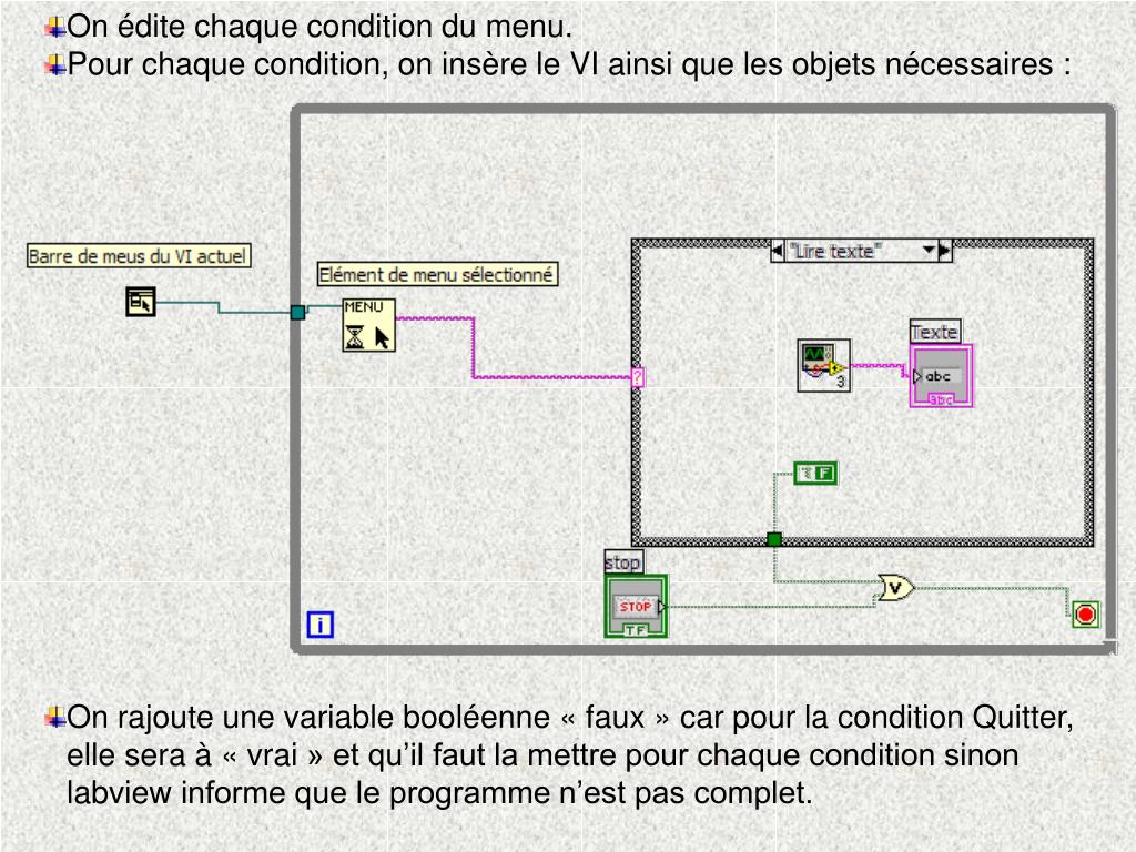 On édite chaque condition du menu. • Pour chaque condition, on insère le VI ainsi que les objets nécessaires : • On rajoute une variable booléenne « faux » car pour la condition Quitter, elle sera à « vrai » et qu’il faut la mettre pour chaque condition sinon labview informe que le programme n’est pas complet.