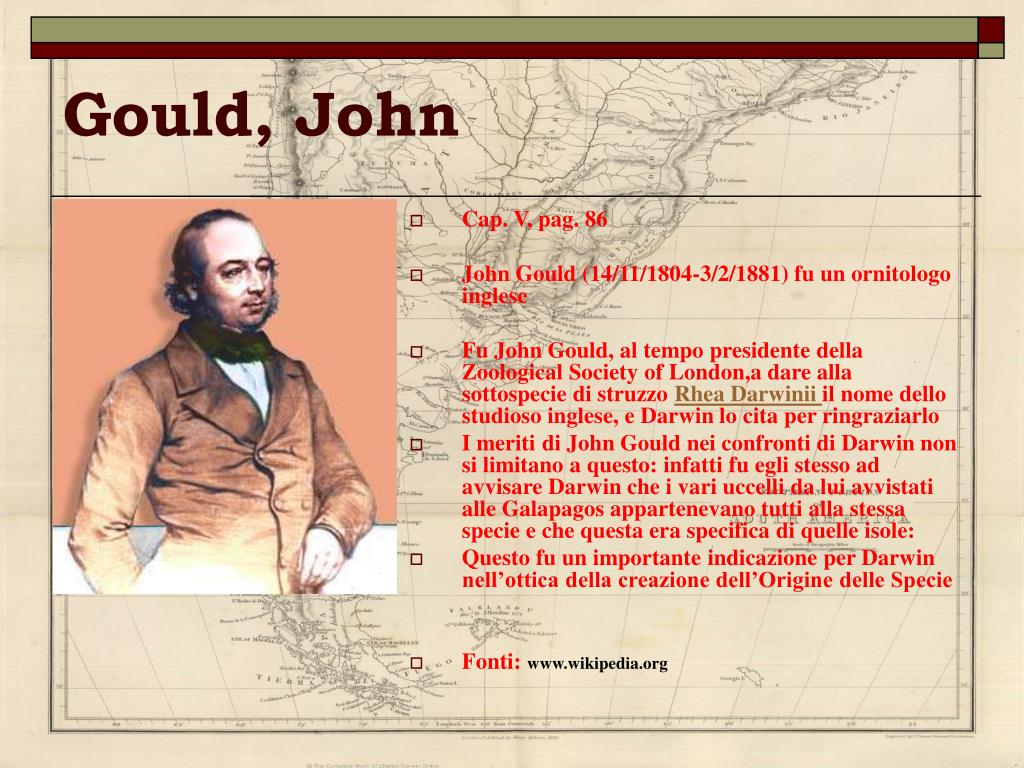 Gould, John • Cap. V, pag. 86 • John Gould (14/11/1804-3/2/1881) fu un ornitologo inglese • Fu John Gould, al tempo presidente della Zoological Society of London,a dare alla sottospecie di struzzo Rhea Darwinii il nome dello studioso inglese, e Darwin lo cita per ringraziarlo • I meriti di John Gould nei confronti di Darwin non si limitano a questo: infatti fu egli stesso ad avvisare Darwin che i vari uccelli da lui avvistati alle Galapagos appartenevano tutti alla stessa specie e che questa era specifica di quelle isole: • Questo fu un importante indicazione per Darwin nell’ottica della creazione dell’Origine delle Specie • Fonti: www.wikipedia.org