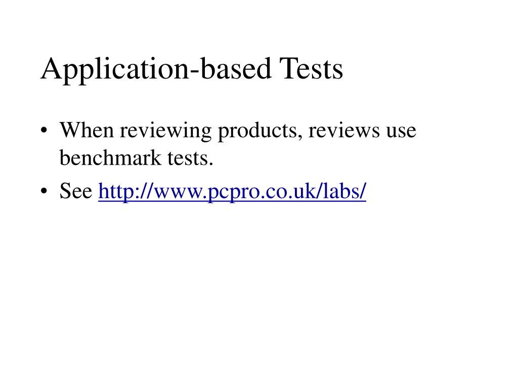 Application-based Tests • When reviewing products, reviews use benchmark tests. • See http://www.pcpro.co.uk/labs/
