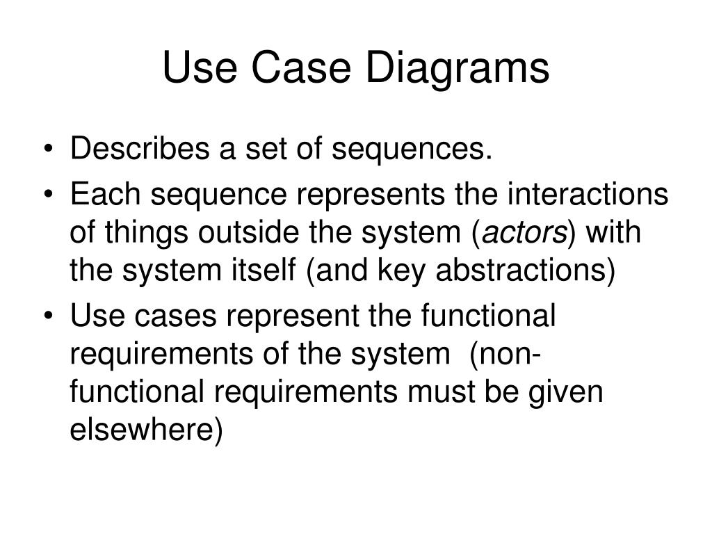 Use Case Diagrams • Describes a set of sequences. • Each sequence represents the interactions of things outside the system (actors) with the system itself (and key abstractions) • Use cases represent the functional requirements of the system (non-functional requirements must be given elsewhere)