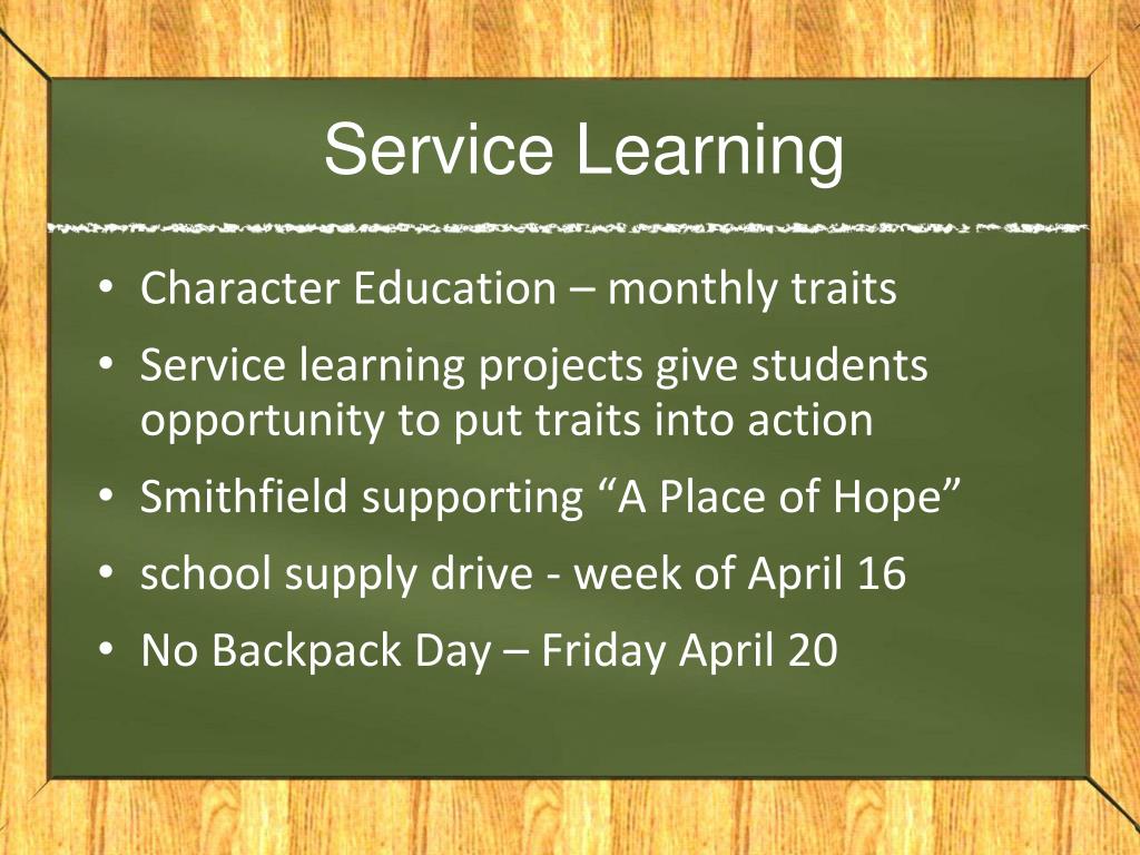 Service Learning Character Education – monthly traits Service learning projects give students opportunity to put traits into action Smithfield supporting “A Place of Hope” school supply drive - week of April 16 No Backpack Day – Friday April 20