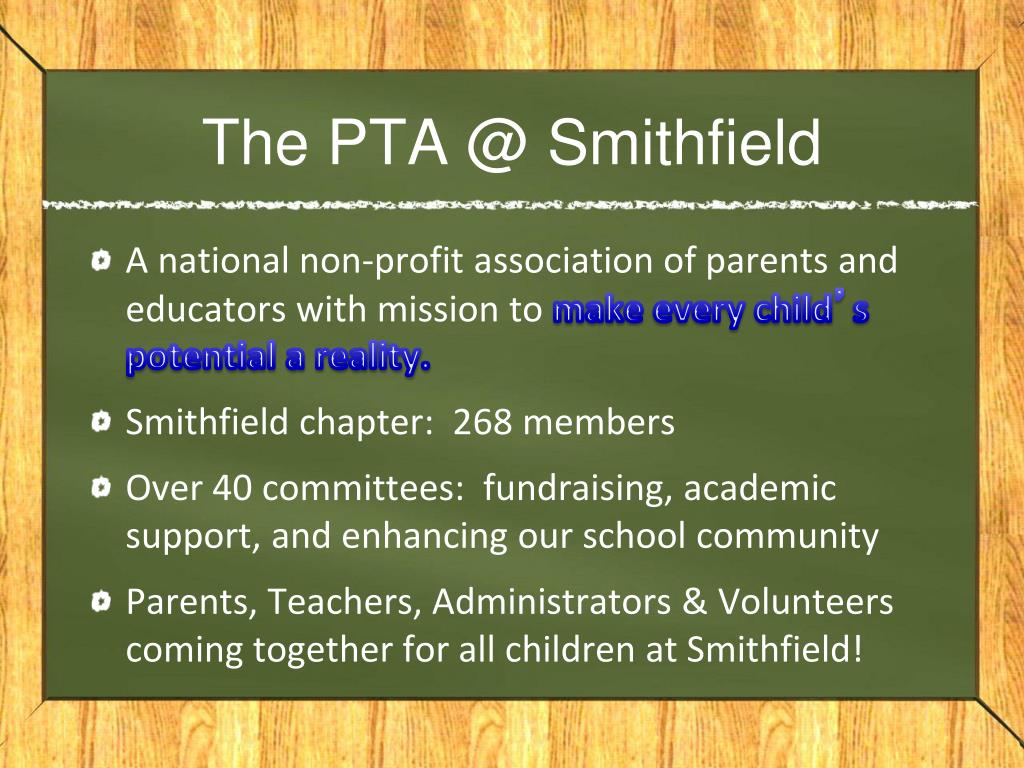 The PTA @ Smithfield • A national non-profit association of parents and educators with mission to make every child’s potential a reality. • Smithfield chapter: 268 members • Over 40 committees: fundraising, academic support, and enhancing our school community • Parents, Teachers, Administrators & Volunteers coming together for all children at Smithfield!