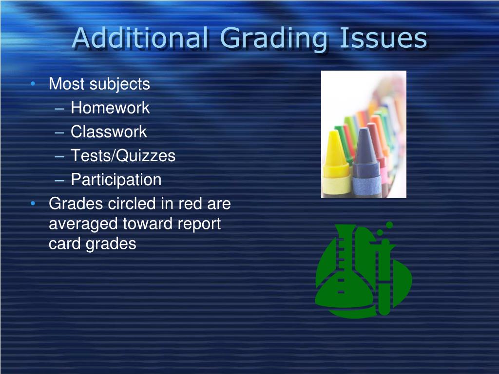 Additional Grading Issues • Most subjects • Homework • Classwork • Tests/Quizzes • Participation • Grades circled in red are averaged toward report card grades