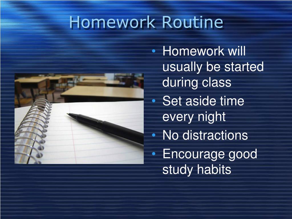 Homework Routine • Homework will usually be started during class • Set aside time every night • No distractions • Encourage good study habits