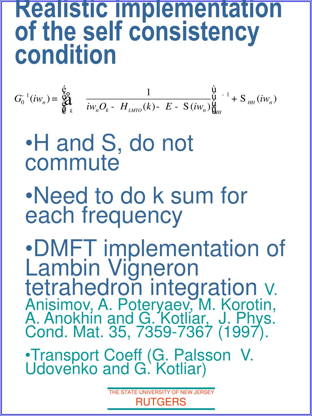 Realistic implementation of the self consistency condition • H and S, do not commute • Need to do k sum for each frequency • DMFT implementation of Lambin Vigneron tetrahedron integration V. Anisimov, A. Poteryaev, M. Korotin, A. Anokhin and G. Kotliar, J. Phys. Cond. Mat. 35, 7359-7367 (1997). • Transport Coeff (G. Palsson V. Udovenko and G. Kotliar) THE STATE UNIVERSITY OF NEW JERSEY RUTGERS