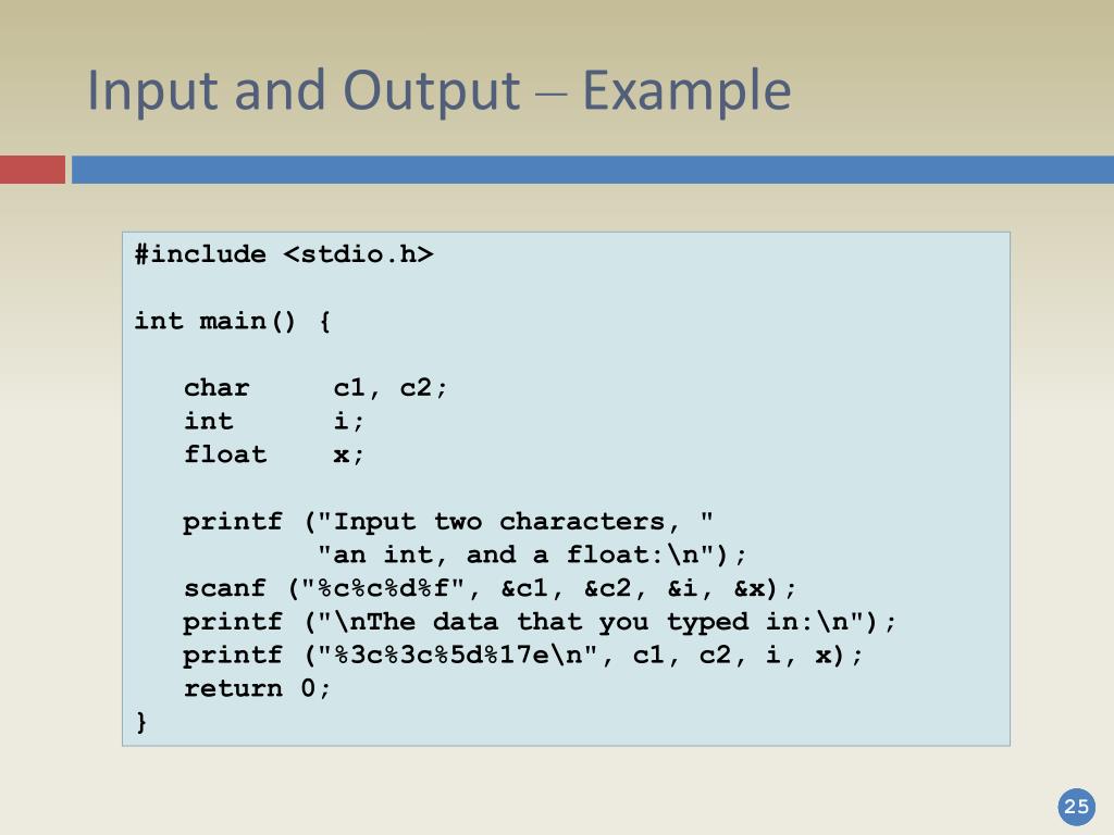 Input and Output – Example #include <stdio.h> int main() { char c1, c2; int i; float x; printf ("Input two characters, " "an int, and a float:\n"); scanf ("%c%c%d%f", &c1, &c2, &i, &x); printf ("\nThe data that you typed in:\n"); printf ("%3c%3c%5d%17e\n", c1, c2, i, x); return 0; }
