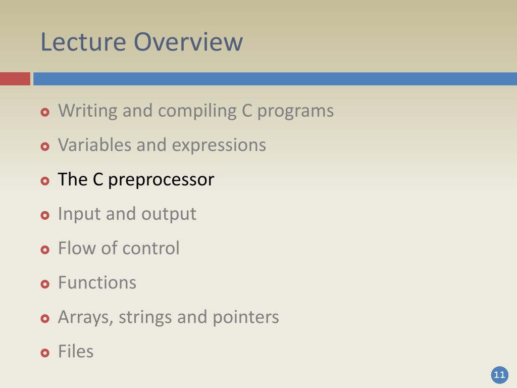 Lecture Overview • Writing and compiling C programs • Variables and expressions • The C preprocessor • Input and output • Flow of control • Functions • Arrays, strings and pointers • Files