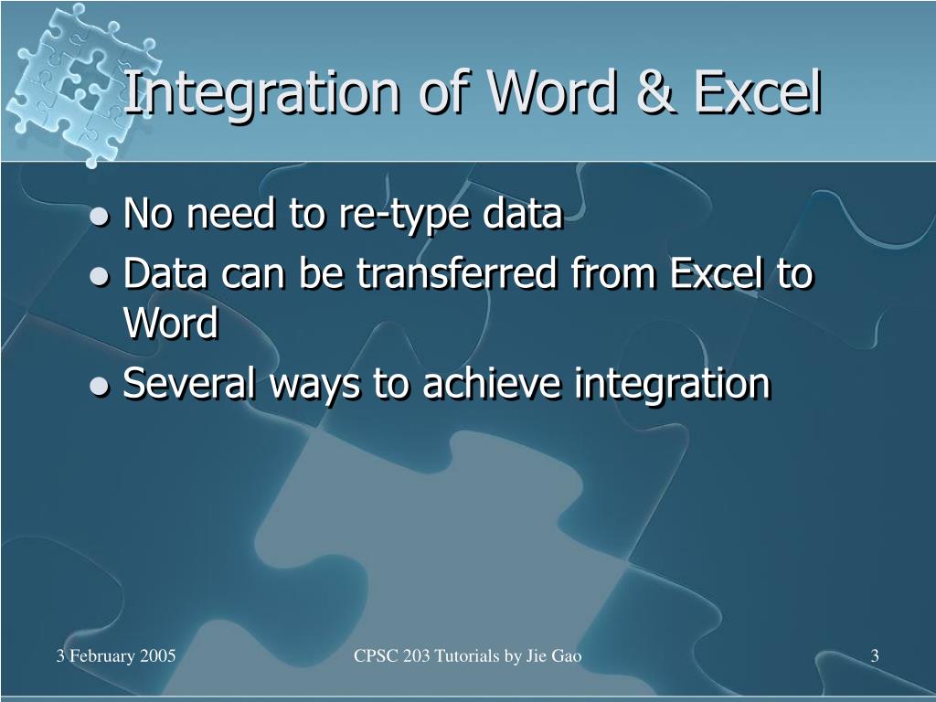 Integration of Word & Excel • No need to re-type data • Data can be transferred from Excel to Word • Several ways to achieve integration CPSC 203 Tutorials by Jie Gao