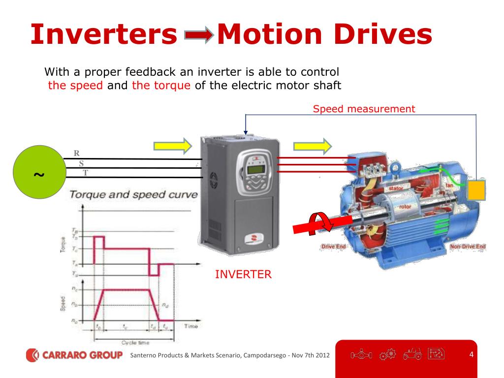 Inverters Motion Drives • With a proper feedback an inverter is able to controlthe speed and the torque of the electric motor shaft • Speed measurement R ~ S T • INVERTER