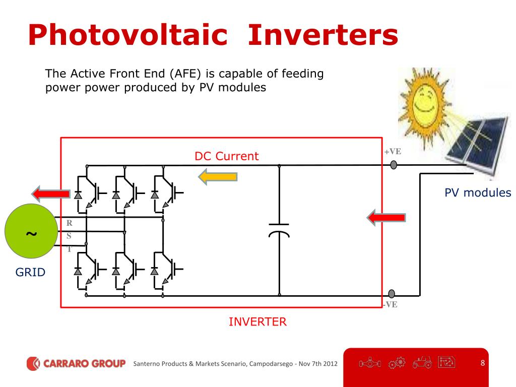 +VE -VE Photovoltaic Inverters • The Active Front End (AFE) is capable of feeding power power produced by PV modules • DC Current • PV modules ~ R S T • GRID • INVERTER