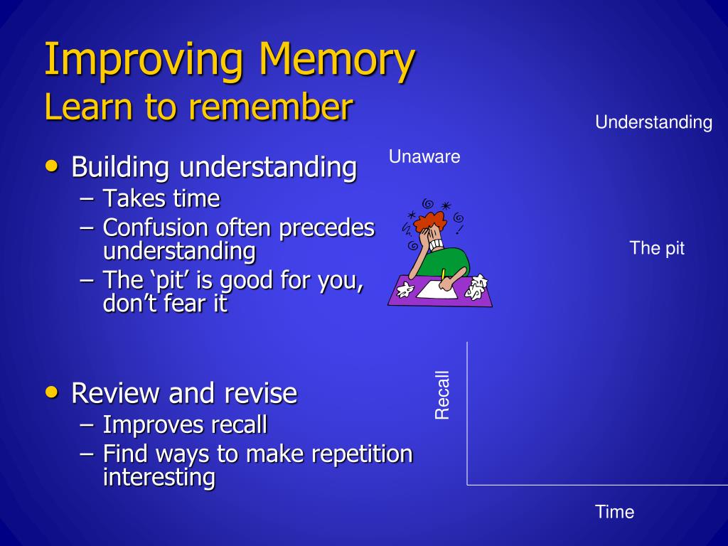 Improving MemoryLearn to remember Understanding Unaware • Building understanding • Takes time • Confusion often precedes understanding • The ‘pit’ is good for you, don’t fear it • Review and revise • Improves recall • Find ways to make repetition interesting The pit Recall Time