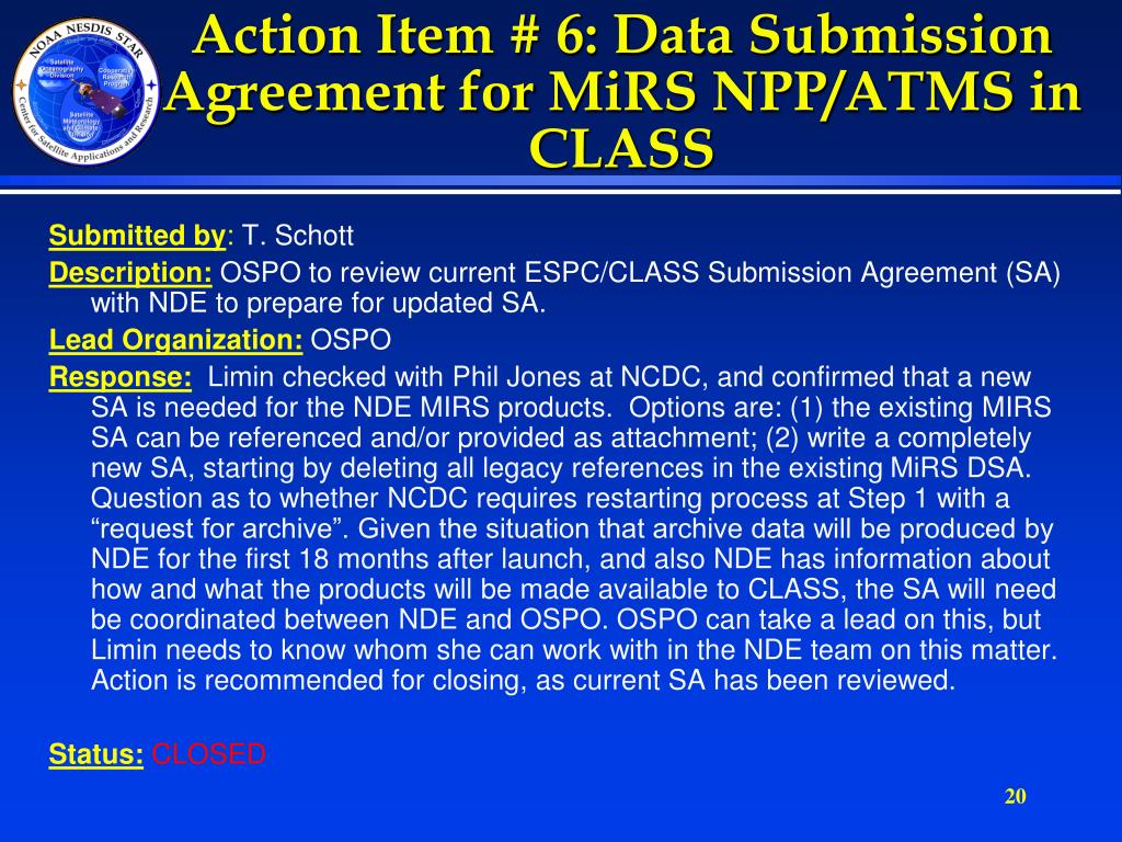 Action Item # 6: Data Submission Agreement for MiRS NPP/ATMS in CLASS Submitted by: T. Schott Description:OSPO to review current ESPC/CLASS Submission Agreement (SA) with NDE to prepare for updated SA. Lead Organization:OSPO Response:Limin checked with Phil Jones at NCDC, and confirmed that a new SA is needed for the NDE MIRS products. Options are: (1) the existing MIRS SA can be referenced and/or provided as attachment; (2) write a completely new SA, starting by deleting all legacy references in the existing MiRS DSA. Question as to whether NCDC requires restarting process at Step 1 with a “request for archive”. Given the situation that archive data will be produced by NDE for the first 18 months after launch, and also NDE has information about how and what the products will be made available to CLASS, the SA will need be coordinated between NDE and OSPO. OSPO can take a lead on this, but Limin needs to know whom she can work with in the NDE team on this matter. Action is recommended for closing, as current SA has been reviewed. Status:CLOSED
