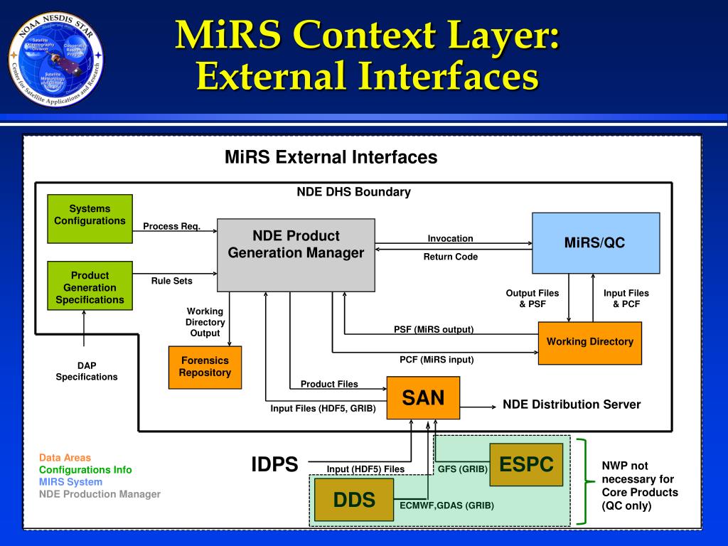 MiRS Context Layer:External Interfaces MiRS External Interfaces NDE DHS Boundary Systems Configurations Process Req. NDE Product Invocation MiRS/QC Generation Manager Return Code Product Rule Sets Generation Output Files Input Files Specifications & PSF & PCF Working Directory PSF (MiRS output) Output Working Directory PCF (MiRS input) Forensics DAP Repository Specifications Product Files SAN NDE Distribution Server Input Files (HDF5, GRIB) Data Areas NWP not necessary for Core Products (QC only) IDPS ESPC Configurations Info Input (HDF5) Files GFS (GRIB) MIRS System DDS NDE Production Manager ECMWF,GDAS (GRIB) 1