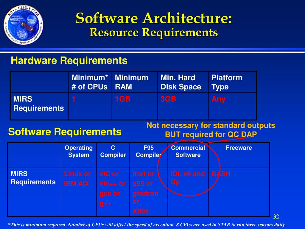 Software Architecture:Resource Requirements Hardware Requirements Not necessary for standard outputs BUT required for QC DAP Software Requirements *This is minimum required. Number of CPUs will affect the speed of execution. 8 CPUs are used in STAR to run three sensors daily.