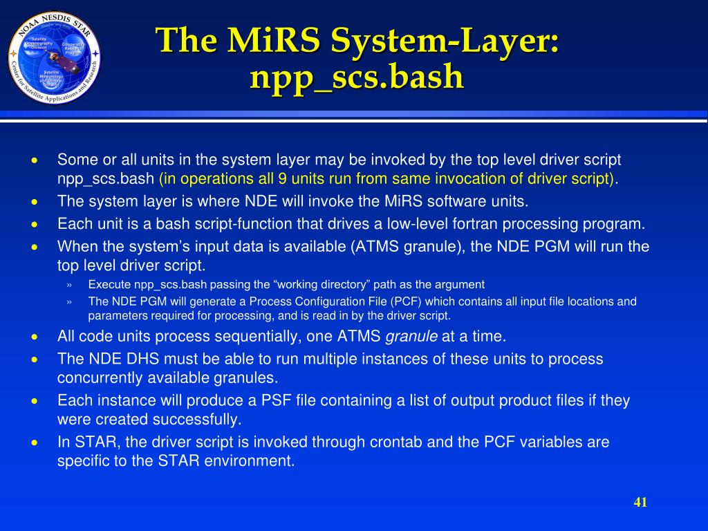 The MiRS System-Layer:npp_scs.bash • Some or all units in the system layer may be invoked by the top level driver script npp_scs.bash (in operations all 9 units run from same invocation of driver script). • The system layer is where NDE will invoke the MiRS software units. • Each unit is a bash script-function that drives a low-level fortran processing program. • When the system’s input data is available (ATMS granule), the NDE PGM will run the top level driver script. • Execute npp_scs.bash passing the “working directory” path as the argument • The NDE PGM will generate a Process Configuration File (PCF) which contains all input file locations and parameters required for processing, and is read in by the driver script. • All code units process sequentially, one ATMS granule at a time. • The NDE DHS must be able to run multiple instances of these units to process concurrently available granules. • Each instance will produce a PSF file containing a list of output product files if they were created successfully. • In STAR, the driver script is invoked through crontab and the PCF variables are specific to the STAR environment.
