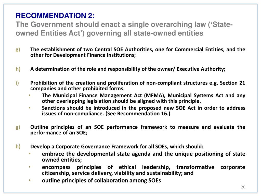 RECOMMENDATION 2:The Government should enact a single overarching law (‘State-owned Entities Act’) governing all state-owned entities • The establishment of two Central SOE Authorities, one for Commercial Entities, and the other for Development Finance Institutions; • A determination of the role and responsibility of the owner/ Executive Authority; • Prohibition of the creation and proliferation of non-compliant structures e.g. Section 21 companies and other prohibited forms: • The Municipal Finance Management Act (MFMA), Municipal Systems Act and any other overlapping legislation should be aligned with this principle. • Sanctions should be introduced in the proposed new SOE Act in order to address issues of non-compliance. (See Recommendation 16.) • Outline principles of an SOE performance framework to measure and evaluate the performance of an SOE; • Develop a Corporate Governance Framework for all SOEs, which should: • embrace the developmental state agenda and the unique positioning of state owned entities; • encompass principles of ethical leadership, transformative corporate citizenship, service delivery, viability and sustainability; and • outline principles of collaboration among SOEs
