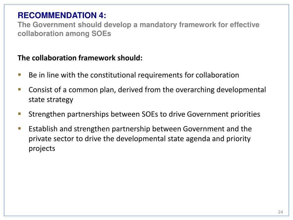 RECOMMENDATION 4:The Government should develop a mandatory framework for effective collaboration among SOEs The collaboration framework should: • Be in line with the constitutional requirements for collaboration • Consist of a common plan, derived from the overarching developmental state strategy • Strengthen partnerships between SOEs to drive Government priorities • Establish and strengthen partnership between Government and the private sector to drive the developmental state agenda and priority projects