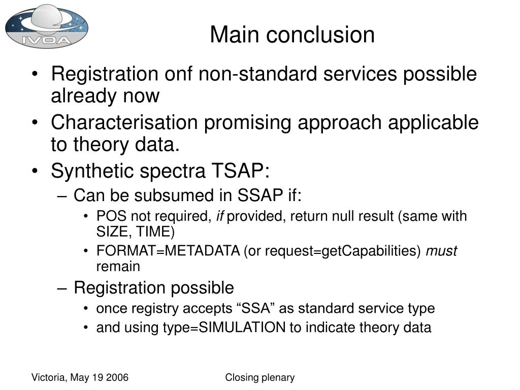 Main conclusion • Registration onf non-standard services possible already now • Characterisation promising approach applicable to theory data. • Synthetic spectra TSAP: • Can be subsumed in SSAP if: • POS not required, if provided, return null result (same with SIZE, TIME) • FORMAT=METADATA (or request=getCapabilities) must remain • Registration possible • once registry accepts “SSA” as standard service type • and using type=SIMULATION to indicate theory data Closing plenary