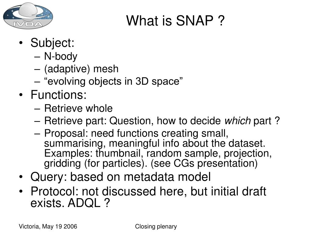 What is SNAP ? • Subject: • N-body • (adaptive) mesh • “evolving objects in 3D space” • Functions: • Retrieve whole • Retrieve part: Question, how to decide which part ? • Proposal: need functions creating small, summarising, meaningful info about the dataset. Examples: thumbnail, random sample, projection, gridding (for particles). (see CGs presentation) • Query: based on metadata model • Protocol: not discussed here, but initial draft exists. ADQL ? Closing plenary