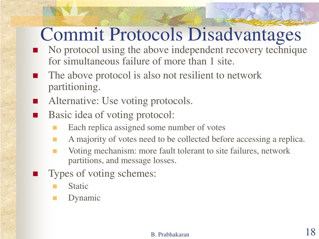 Commit Protocols Disadvantages • No protocol using the above independent recovery technique for simultaneous failure of more than 1 site. • The above protocol is also not resilient to network partitioning. • Alternative: Use voting protocols. • Basic idea of voting protocol: • Each replica assigned some number of votes • A majority of votes need to be collected before accessing a replica. • Voting mechanism: more fault tolerant to site failures, network partitions, and message losses. • Types of voting schemes: • Static • Dynamic B. Prabhakaran