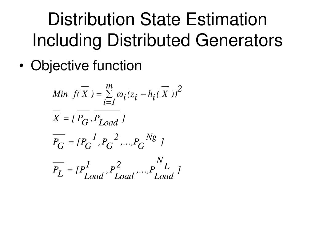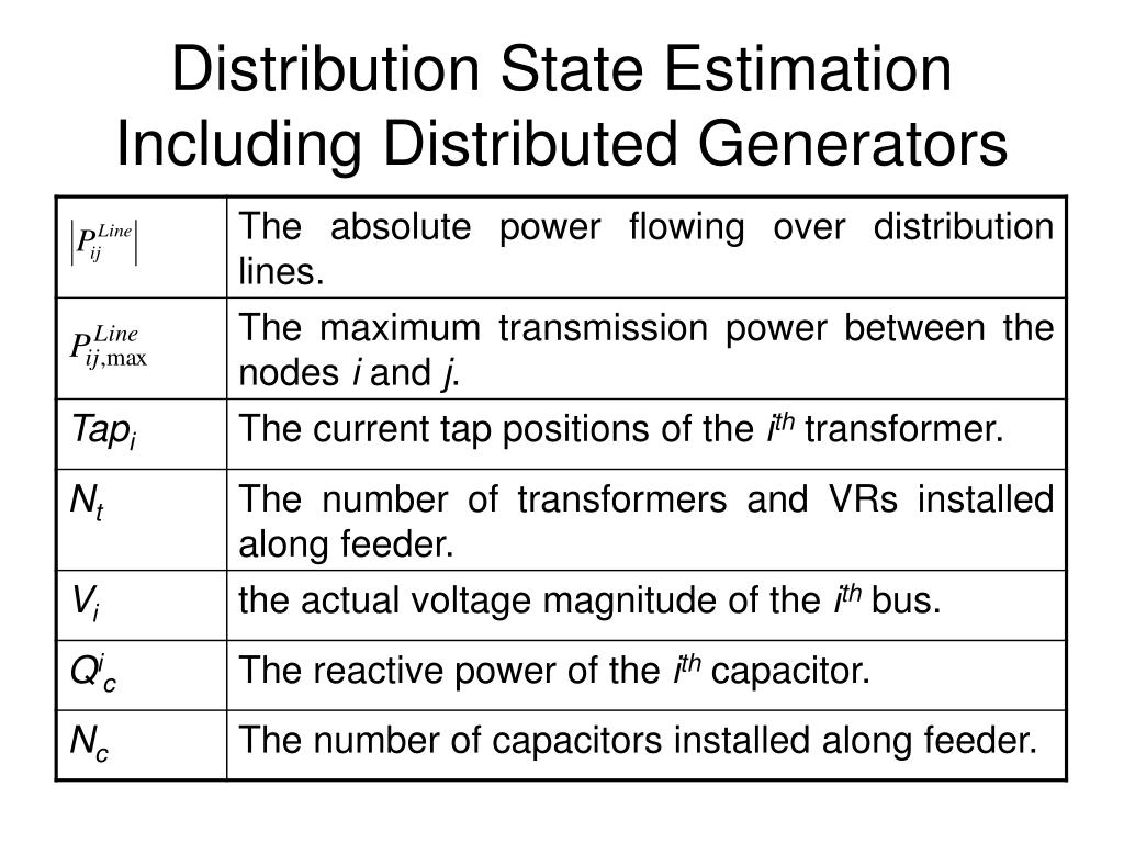 Distribution State Estimation Including Distributed Generators • In order to have a unique solution, these assumptions should be made: • Status of distribution lines and switches is known. • A contracted load and distributed generation values are known at each node. • Voltage and current at the substation bus (main bus) are known. • If outputs of DGs and loads are fixed, the outputs and power factors will be available. • If outputs of DGs and loads are variable, the average outputs, the standard deviations and the power factors can be obtained. • Set points of VRs and local capacitors are known.
