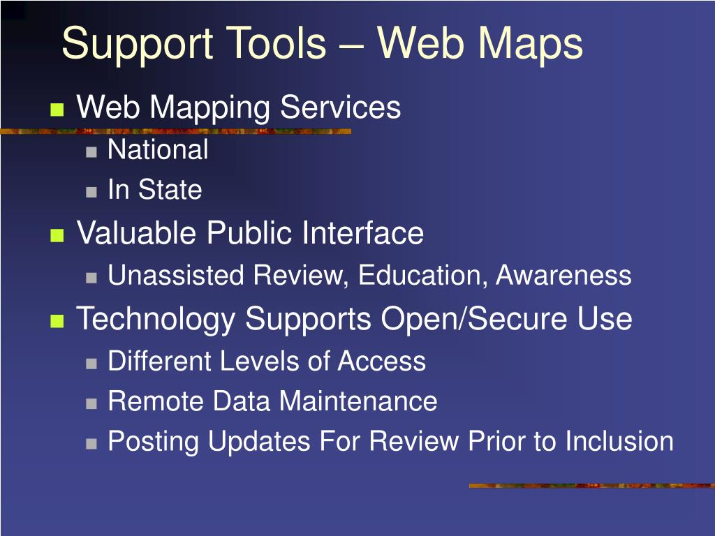 Support Tools – Web Maps • Web Mapping Services • National • In State • Valuable Public Interface • Unassisted Review, Education, Awareness • Technology Supports Open/Secure Use • Different Levels of Access • Remote Data Maintenance • Posting Updates For Review Prior to Inclusion