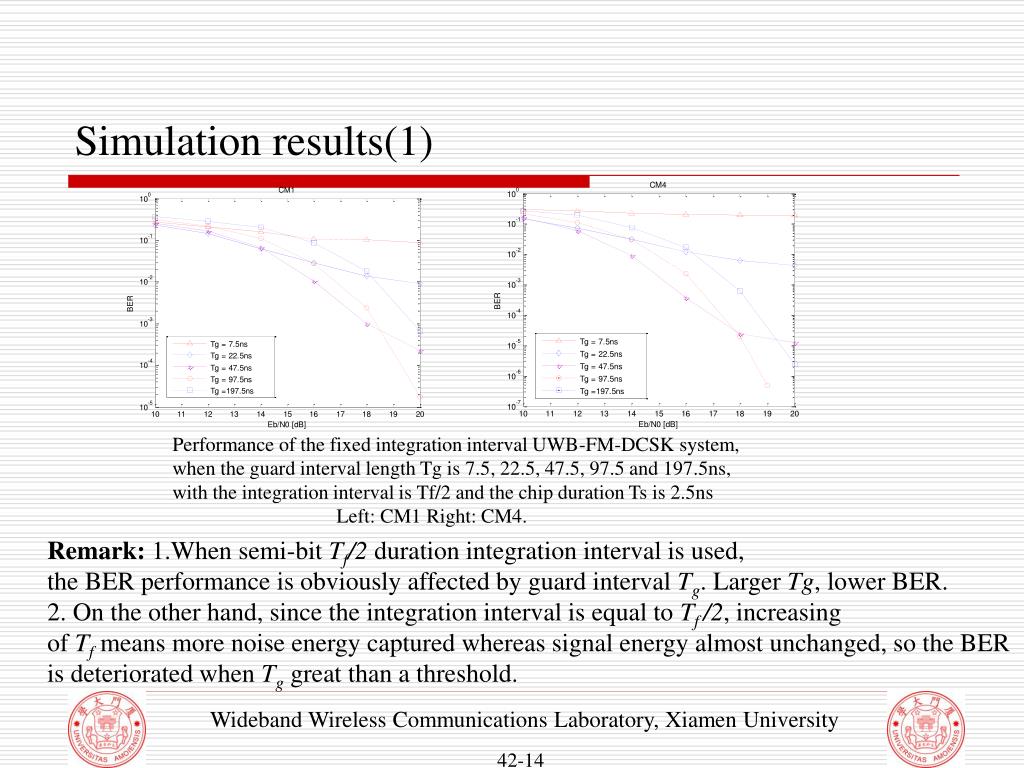 Simulation results(1) Performance of the fixed integration interval UWB-FM-DCSK system, when the guard interval length Tg is 7.5, 22.5, 47.5, 97.5 and 197.5ns, with the integration interval is Tf/2 and the chip duration Ts is 2.5ns Left: CM1 Right: CM4. Remark: 1.When semi-bit Tf/2 duration integration interval is used, the BER performance is obviously affected by guard interval Tg. Larger Tg, lower BER. 2. On the other hand, since the integration interval is equal to Tf /2, increasing of Tf means more noise energy captured whereas signal energy almost unchanged, so the BER is deteriorated when Tg great than a threshold. Wideband Wireless Communications Laboratory, Xiamen University