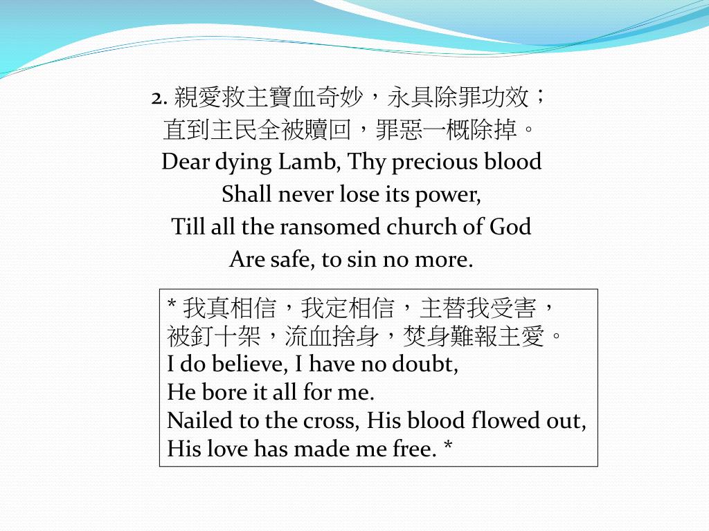 2. 親愛救主寶血奇妙,永具除罪功效;直到主民全被贖回,罪惡一概除掉。 Dear dying Lamb, Thy precious bloodShall never lose its power, Till all the ransomed church of GodAre safe, to sin no more. * 我真相信,我定相信,主替我受害, 被釘十架,流血捨身,焚身難報主愛。I do believe, I have no doubt, He bore it all for me. Nailed to the cross, His blood flowed out, His love has made me free. *