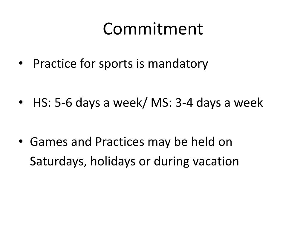 Commitment • Practice for sports is mandatory • HS: 5-6 days a week/ MS: 3-4 days a week • Games and Practices may be held on Saturdays, holidays or during vacation