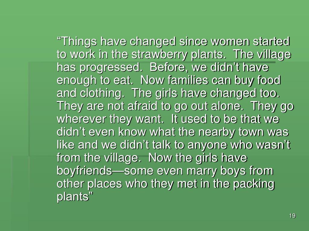 “Things have changed since women started to work in the strawberry plants. The village has progressed. Before, we didn’t have enough to eat. Now families can buy food and clothing. The girls have changed too. They are not afraid to go out alone. They go wherever they want. It used to be that we didn’t even know what the nearby town was like and we didn’t talk to anyone who wasn’t from the village. Now the girls have boyfriends—some even marry boys from other places who they met in the packing plants”