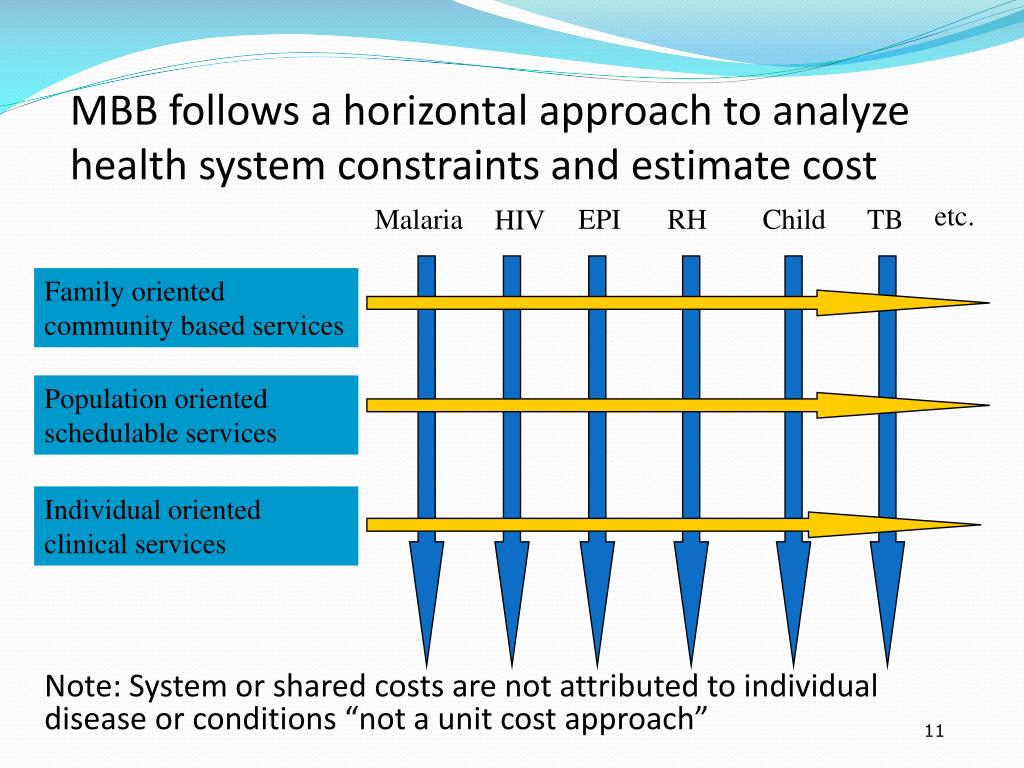 MBB follows a horizontal approach to analyze health system constraints and estimate cost Malaria EPI RH Child TB etc. HIV Family oriented community based services Population oriented schedulable services Individual oriented clinical services Note: System or shared costs are not attributed to individual disease or conditions “not a unit cost approach” 11