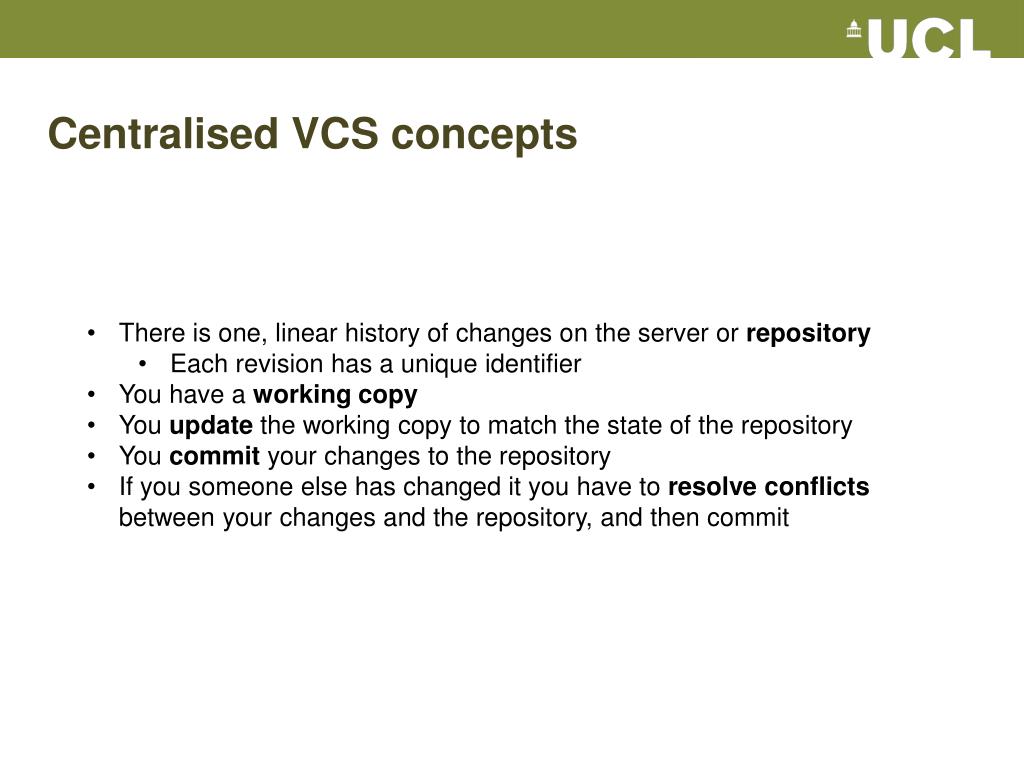 Centralised VCS concepts • There is one, linear history of changes on the server or repository • Each revision has a unique identifier • You have a working copy • You update the working copy to match the state of the repository • You commit your changes to the repository • If you someone else has changed it you have to resolve conflicts between your changes and the repository, and then commit