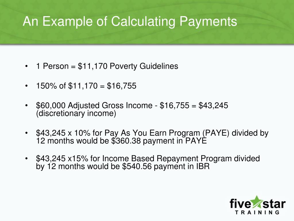 An Example of Calculating Payments • 1 Person = $11,170 Poverty Guidelines • 150% of $11,170 = $16,755 • $60,000 Adjusted Gross Income - $16,755 = $43,245 (discretionary income) • $43,245 x 10% for Pay As You Earn Program (PAYE) divided by 12 months would be $360.38 payment in PAYE • $43,245 x15% for Income Based Repayment Program divided by 12 months would be $540.56 payment in IBR