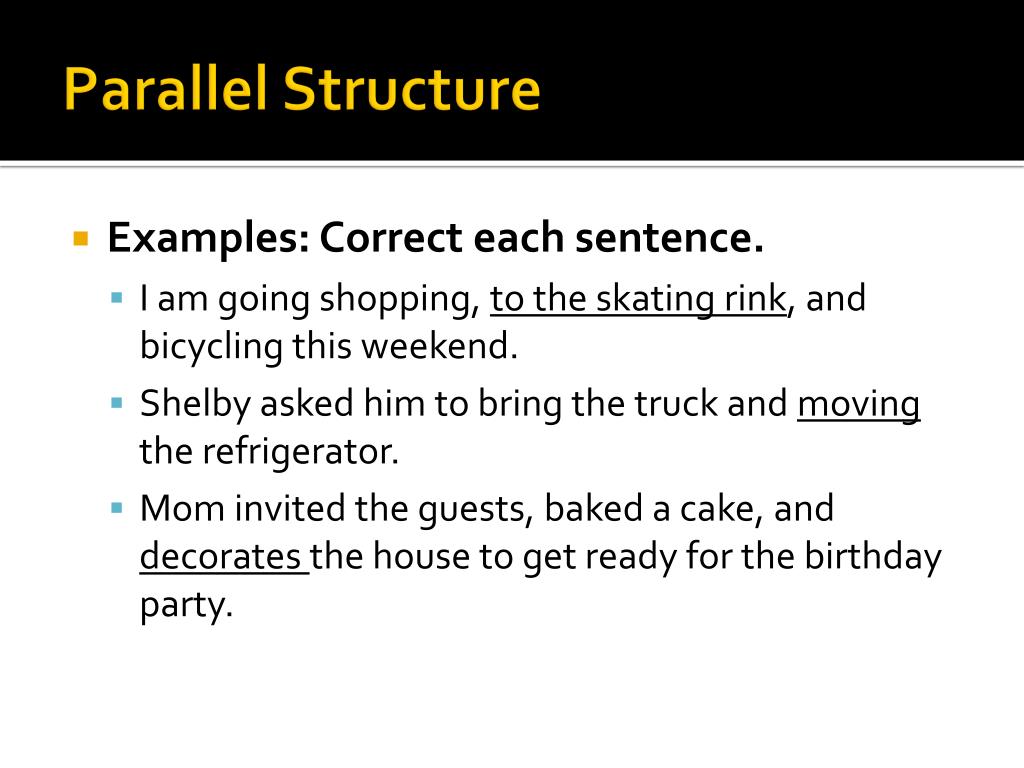 Parallel Structure • Examples: Correct each sentence. • I am going shopping, to the skating rink, and bicycling this weekend. • Shelby asked him to bring the truck and movingthe refrigerator. • Mom invited the guests, baked a cake, and decorates the house to get ready for the birthday party.