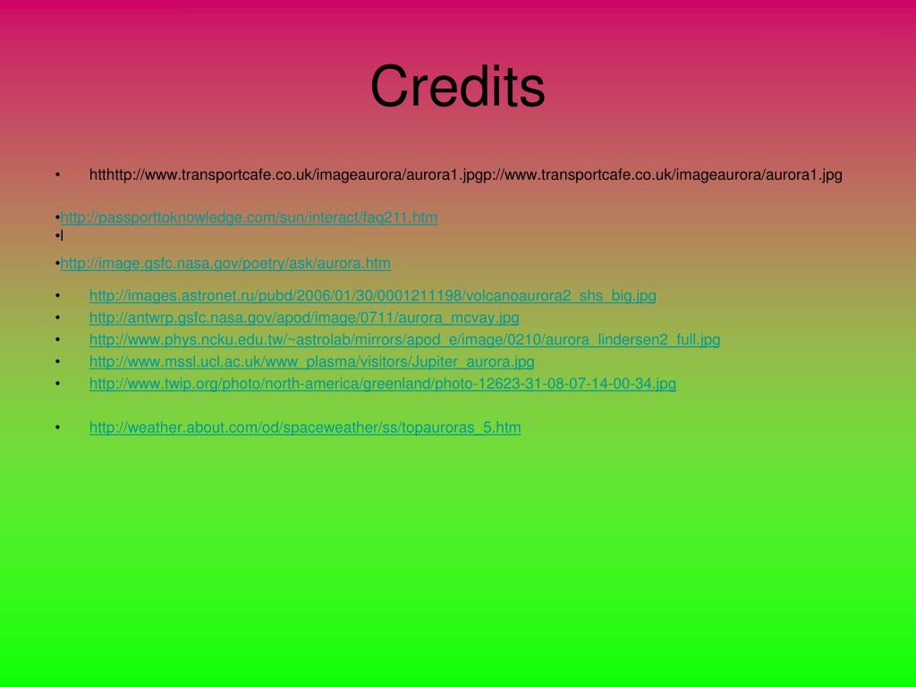 Credits • htthttp://www.transportcafe.co.uk/imageaurora/aurora1.jpgp://www.transportcafe.co.uk/imageaurora/aurora1.jpg • http://images.astronet.ru/pubd/2006/01/30/0001211198/volcanoaurora2_shs_big.jpg • http://antwrp.gsfc.nasa.gov/apod/image/0711/aurora_mcvay.jpg • http://www.phys.ncku.edu.tw/~astrolab/mirrors/apod_e/image/0210/aurora_lindersen2_full.jpg • http://www.mssl.ucl.ac.uk/www_plasma/visitors/Jupiter_aurora.jpg • http://www.twip.org/photo/north-america/greenland/photo-12623-31-08-07-14-00-34.jpg • http://weather.about.com/od/spaceweather/ss/topauroras_5.htm • http://passporttoknowledge.com/sun/interact/faq211.htm • l • http://image.gsfc.nasa.gov/poetry/ask/aurora.htm