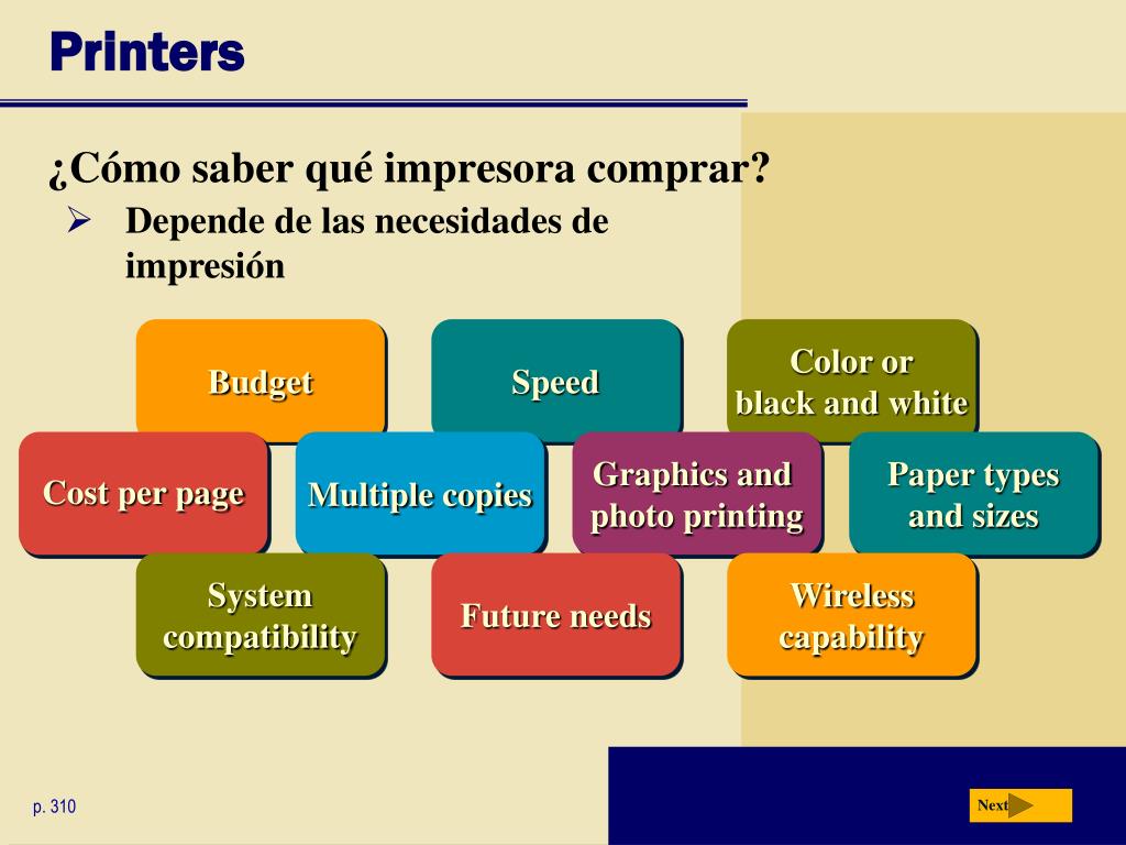 Printers Next ¿Cómo saber qué impresora comprar? • Depende de las necesidades de impresión Budget Speed Color orblack and white Cost per page Multiple copies Graphics and photo printing Paper typesand sizes Systemcompatibility Future needs Wirelesscapability p. 310