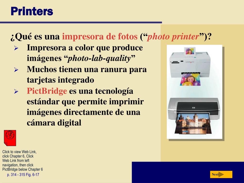 Printers Click to view Web Link,click Chapter 6, Click Web Linkfrom left navigation, then click Printing Digital Camera Images below Chapter 6 Next ¿Cuáles son las diferentes formas de imprimir documentos y fotos? p. 311 Fig. 6-13