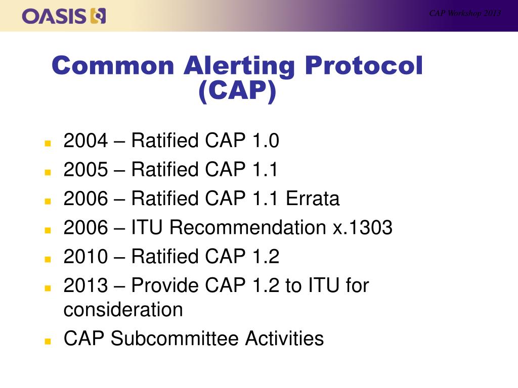 CAP Workshop 2013 Common Alerting Protocol (CAP) • 2004 – Ratified CAP 1.0 • 2005 – Ratified CAP 1.1 • 2006 – Ratified CAP 1.1 Errata • 2006 – ITU Recommendation x.1303 • 2010 – Ratified CAP 1.2 • 2013 – Provide CAP 1.2 to ITU for consideration • CAP Subcommittee Activities
