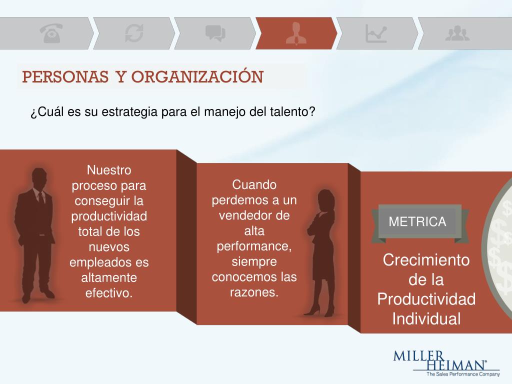 PERSONAS Y ORGANIZACIÓN ¿Cuál es su estrategia para el manejo del talento? Nuestro proceso para conseguir la productividad total de los nuevos empleados es altamente efectivo. Cuando perdemos a un vendedor de alta performance, siempre conocemos las razones. METRICA Crecimiento de la Productividad Individual