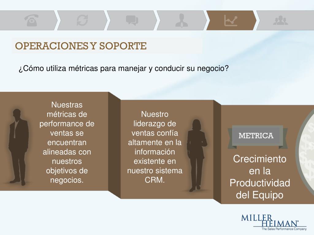OPERACIONES Y SOPORTE ¿Cómo utiliza métricas para manejar y conducir su negocio? Nuestras métricas de performance de ventas se encuentran alineadas con nuestros objetivos de negocios. Nuestro liderazgo de ventas confía altamente en la información existente en nuestro sistema CRM. METRICA Crecimiento en la Productividad del Equipo