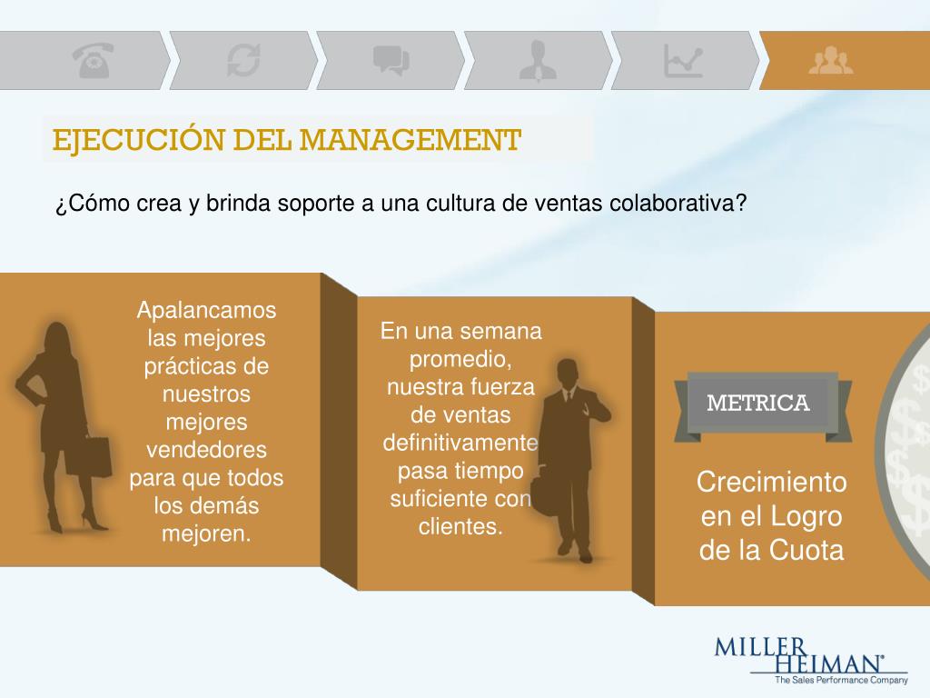 EJECUCIÓN DEL MANAGEMENT ¿Cómo crea y brinda soporte a una cultura de ventas colaborativa? Apalancamos las mejores prácticas de nuestros mejores vendedores para que todos los demás mejoren. En una semana promedio, nuestra fuerza de ventas definitivamente pasa tiempo suficiente con clientes. METRICA Crecimiento en el Logro de la Cuota