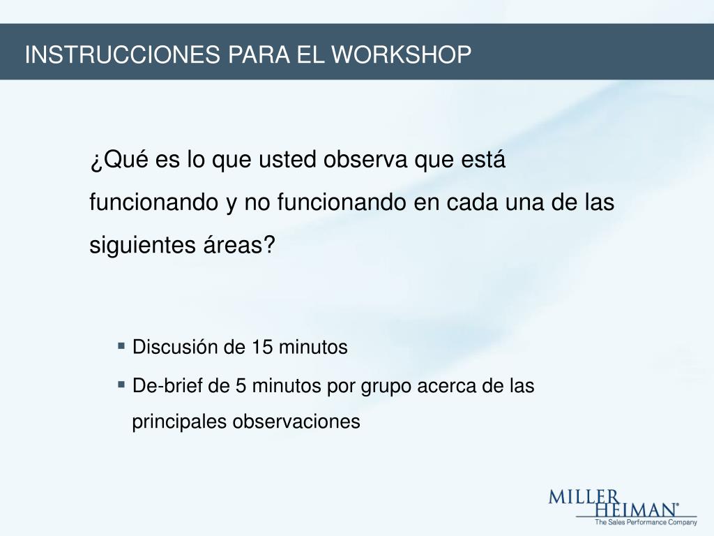 ¿Qué es lo que usted observa que está funcionando y no funcionando en cada una de las siguientes áreas? • Discusión de 15 minutos • De-brief de 5 minutos por grupo acerca de las principales observaciones INSTRUCCIONES PARA EL WORKSHOP • ¿Cómo mejorar la generación de demanda y la performance para prospectar? • ¿Cuáles son los atributos y dinámicas de los compradores en los ciclos de venta exitosos? • ¿Cómo mejorar la retención, satisfacción y lealtad del cliente? • ¿Cuál es nuestra estrategia para el manejo del talento? • ¿Cómo utilizamos las analíticas para manejar y conducir nuestro negocio? • ¿Cómo crear y brindar una cultura de venta colaborativa?