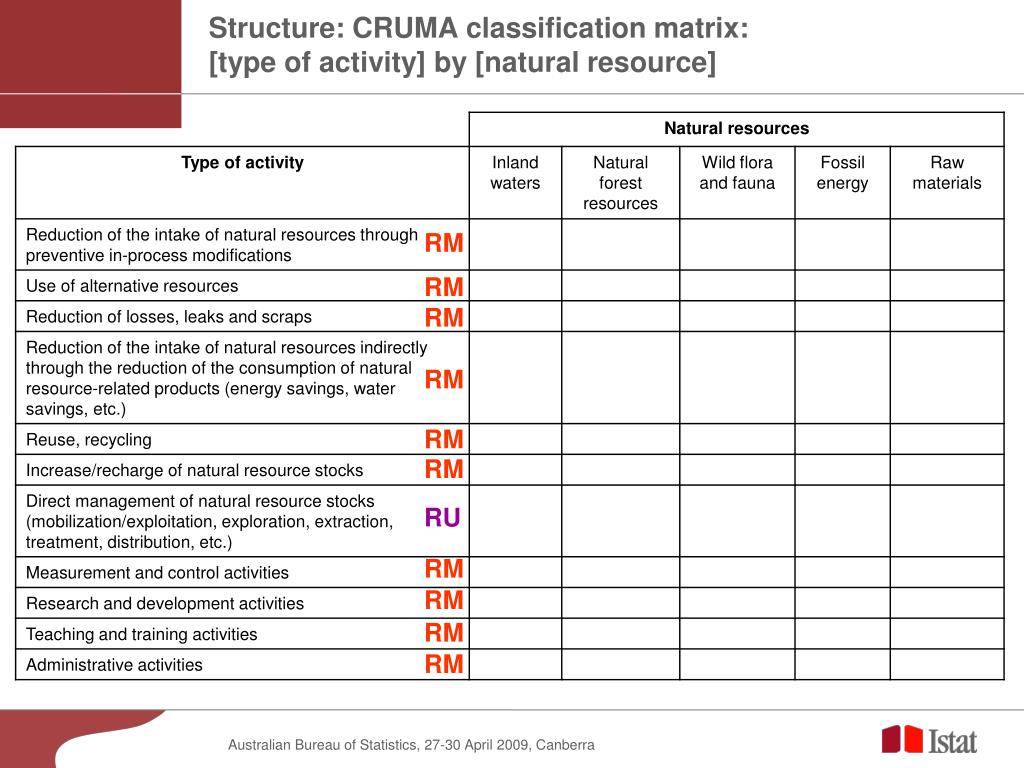 Structure: CRUMA classification matrix: [type of activity] by [natural resource] RM RM RM RM RM RM RU RM RM RM RM