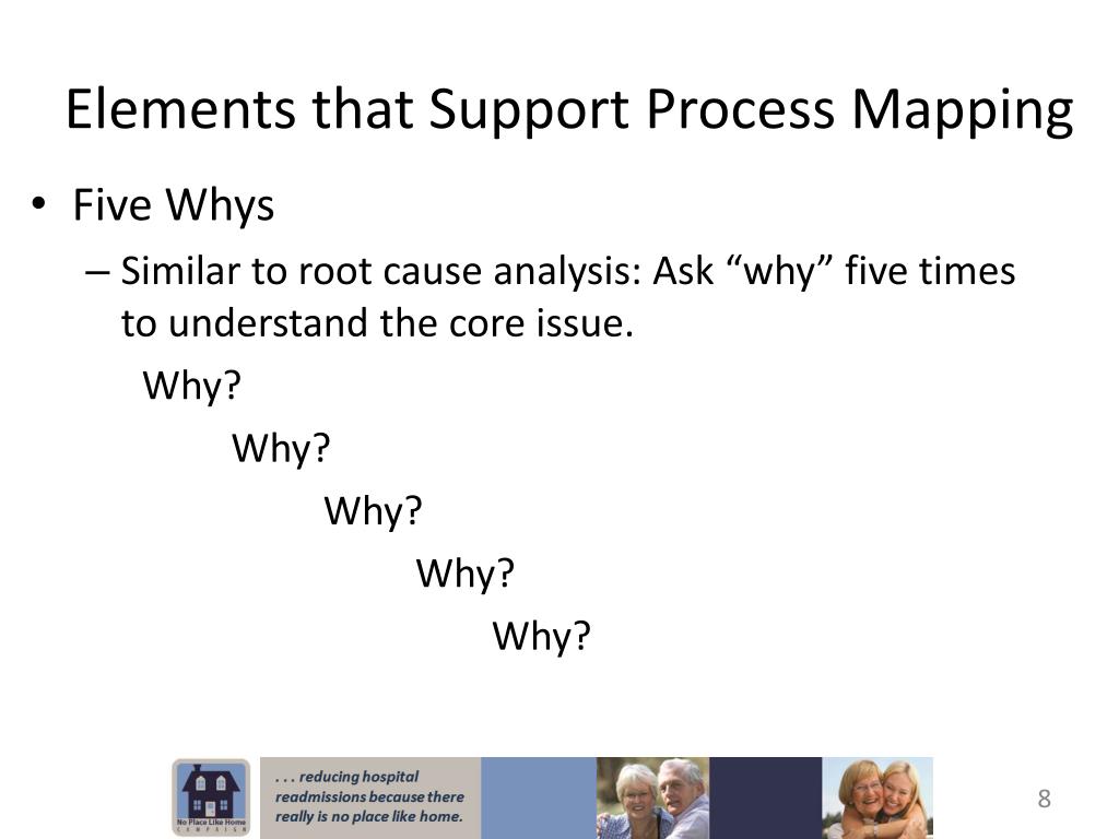 Elements that Support Process Mapping • Five Whys • Similar to root cause analysis: Ask “why” five times to understand the core issue. Why? Why? Why? Why? Why?