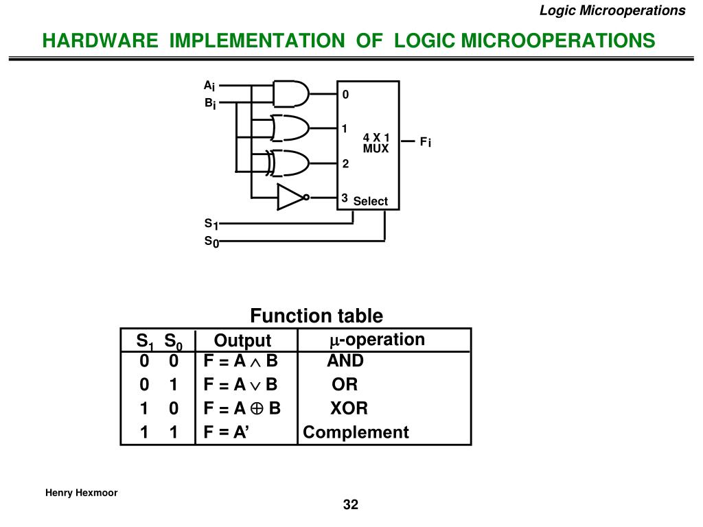Logic Microoperations HARDWARE IMPLEMENTATION OF LOGIC MICROOPERATIONS A i 0 B i 1 4 X 1 F i MUX 2 3 Select S 1 S 0 Function table -operation S1 S0 Output 0 0 F = A B AND 0 1 F = AB OR 1 0 F = A B XOR 1 1 F = A’ Complement