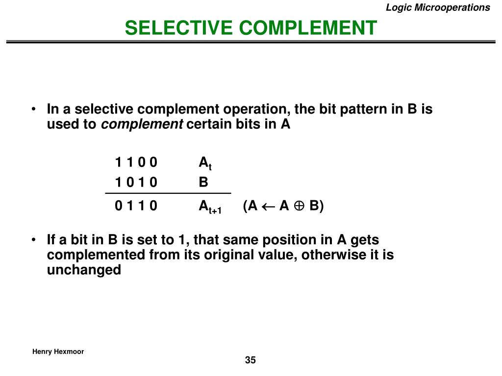 In a selective complement operation, the bit pattern in B is used to complement certain bits in A 1 1 0 0 At 1 0 1 0 B 0 1 1 0 At+1 (A AB) If a bit in B is set to 1, that same position in A gets complemented from its original value, otherwise it is unchanged Logic Microoperations SELECTIVE COMPLEMENT