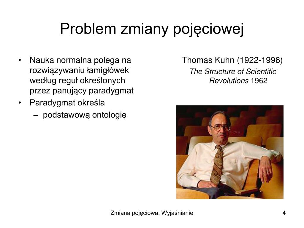 Zmiana pojęciowa. Wyjaśnianie. Thomas Kuhn (1922-1996) The Structure of Scientific Revolutions 1962. Problem zmiany pojęciowej. Nauka normalna polega na rozwiązywaniu łamigłówek według reguł określonych przez panujący paradygmat. Thomas Kuhn (1922-1996)