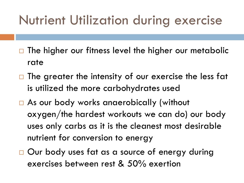 Nutrient Utilization during exercise • The higher our fitness level the higher our metabolic rate • The greater the intensity of our exercise the less fat is utilized the more carbohydrates used • As our body works anaerobically (without oxygen/the hardest workouts we can do) our body uses only carbs as it is the cleanest most desirable nutrient for conversion to energy • Our body uses fat as a source of energy during exercises between rest & 50% exertion