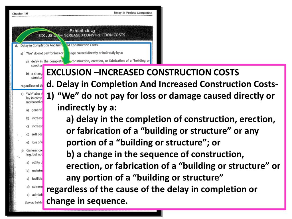 EXCLUSION –INCREASED CONSTRUCTION COSTS • d. Delay in Completion And Increased Construction Costs- • “We” do not pay for loss or damage caused directly or indirectly by a: • a) delay in the completion of construction, erection, or fabrication of a “building or structure” or any portion of a “building or structure”; or • b) a change in the sequence of construction, erection, or fabrication of a “building or structure” or any portion of a “building or structure” • regardless of the cause of the delay in completion or change in sequence.