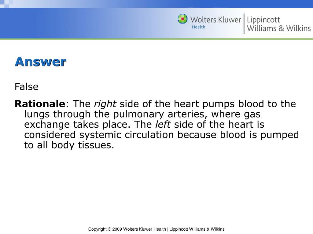 Answer False Rationale:The right side of the heart pumps blood to the lungs through the pulmonary arteries, where gas exchange takes place. The left side of the heart is considered systemic circulation because blood is pumped to all body tissues.